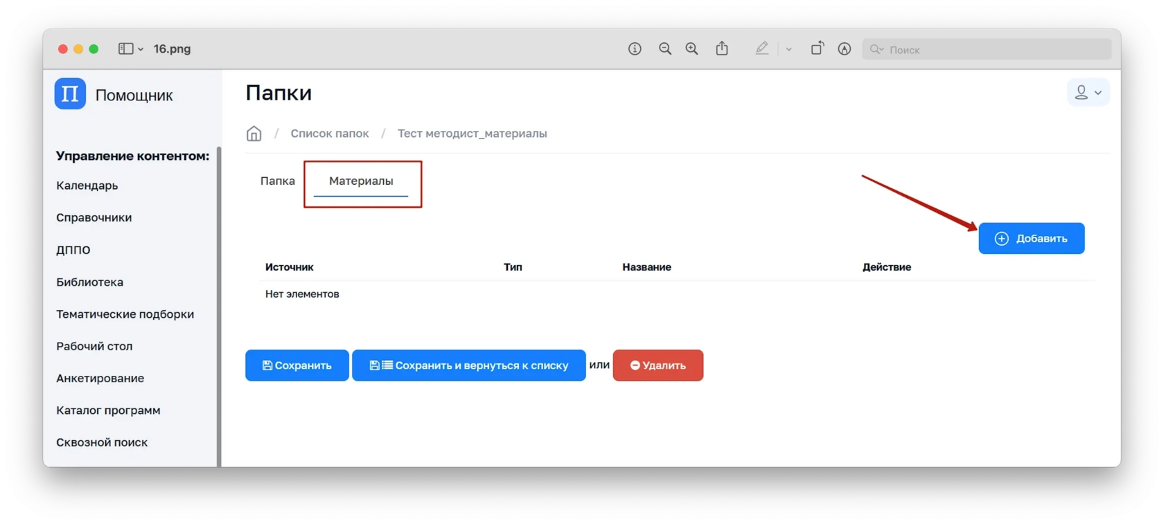 Персональный раздел для учителей, где они могут собирать и структурировать нужные материалы из разных разделов Системы. Учителя могут создавать собственные папки с контентом (например, для подготовки к урокам или аттестации), а также использовать готовые папки, которые заранее подготовили администраторы Системы.