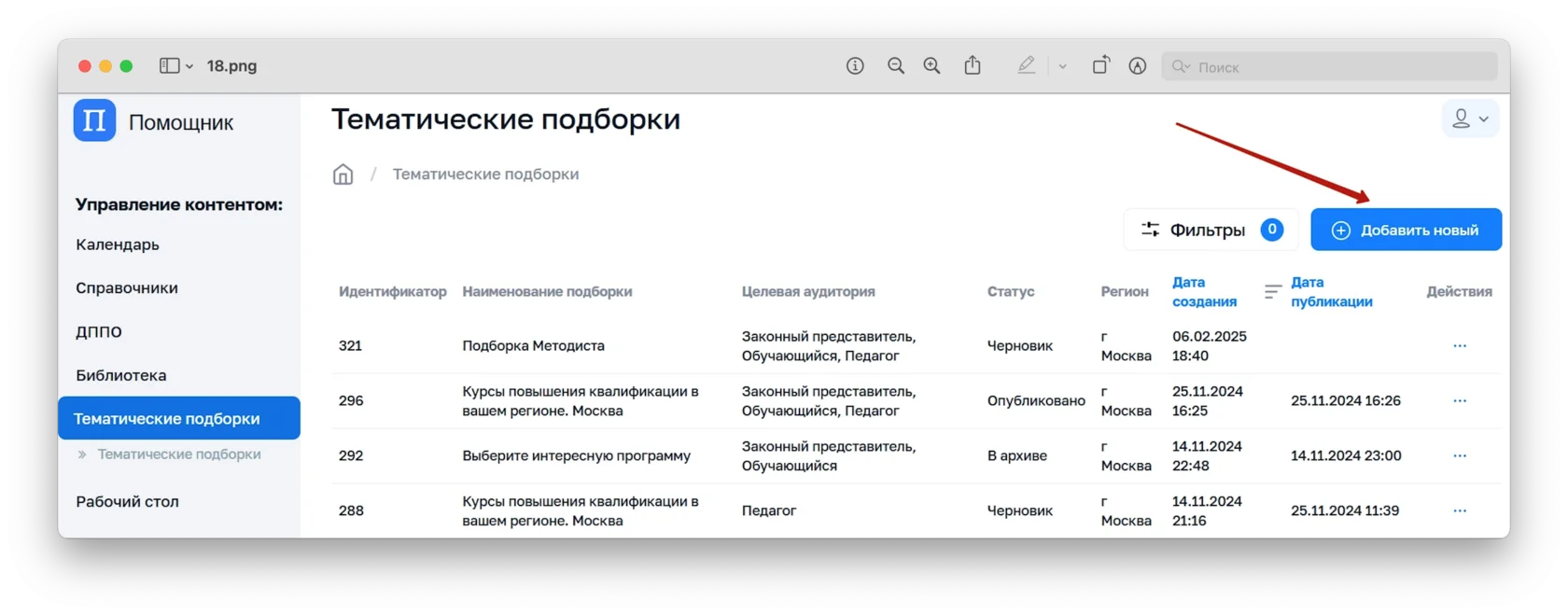 - Откроется таблица/список добавленных ранее подборок